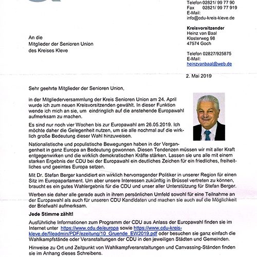Heinz van Baal schreibt an die Mitglieder der Senioren Union im Kreis Kleve