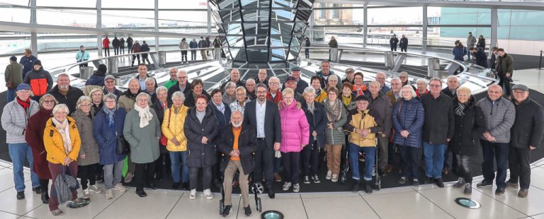 Stefan Rouenhoff MdB mit seinen Gästen aus dem Kreis Kleve unter der Kuppel auf dem Dach des Reichstagsgebäudes (Bildnachweis: Wahlkreisbüro Stefan Rouenhoff) Unter den Besuchern befanden sich neben Vertretern des gemeinnützigen Kevelaerer Vereins ‚Senioren aktiv‘ auch ehemalige Vorstandsmitglieder und Wehrführer des Kreisfeuerwehrverbandes sowie Kommunalpolitiker der Senioren Union aus der Stadt Kalkar und der Gemeinde Uedem.