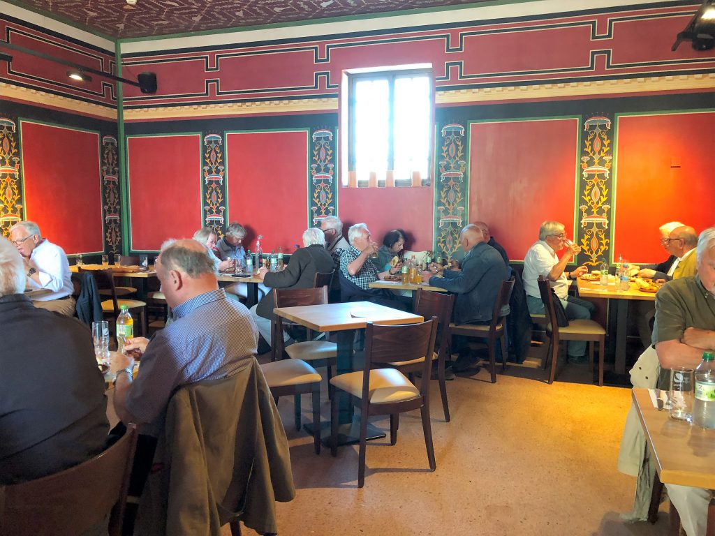 Zu Mittag wurde in der archäologischen Herberge ein schmackhafter „Porculi ofellae ostiensis cum boletis“, Ferkelbraten auf Ostienser Art mit Kraut serviert.